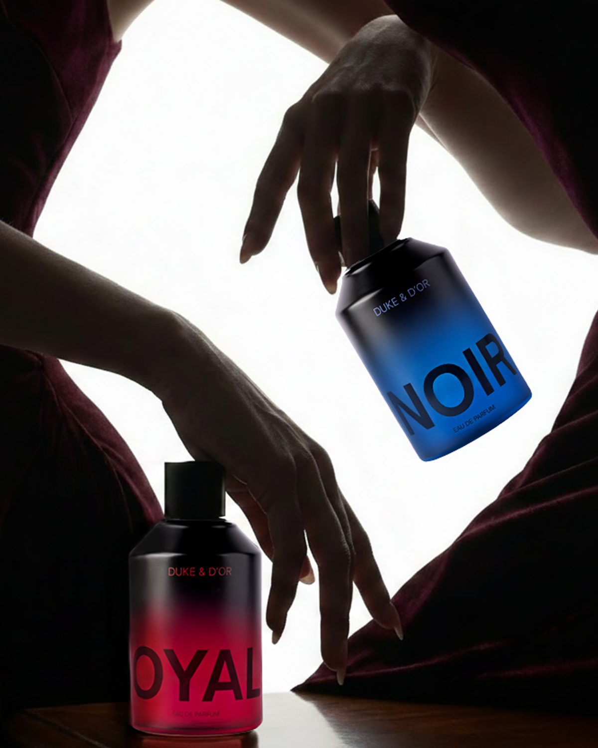 The Duo brings together the two signature creations of the house. Noir unfolds with crisp spice and elegant woods, a fragrance of strength and magnetism. Royale radiates with saffron, jasmine and oakmoss, an expression of opulence and grace.